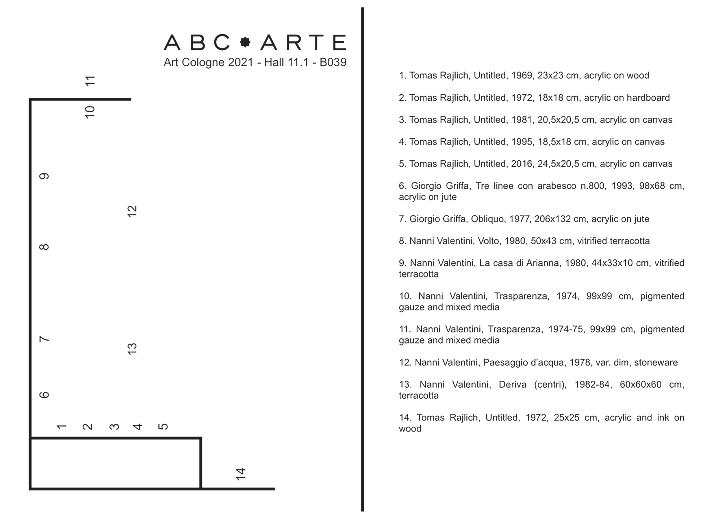 Il lavoro che verrà esibito ad Art Cologne, datato 1993 è pubblicato sul libro (edito da Silvana Editoriale) della mostra MAKE IT NEW! Tomas Rajlich e l'arte astratta in Italia recentemente tenutasi presso il Museo di Arte Contemporanea Villa Croce di Genova, in cui opere di Tomas Rajlich hanno potuto dialogare con circa trenta importanti opere del secondo dopoguerra italiano. Il lavoro Obliquo blu del 1977, è realizzato con uno dei colori iconici della produzione di Griffa degli anni Settanta (ciò sarà evidente ai visitatori della prossima mostra di Griffa presso il Centre Georges Pompidou di Parigi, nel prossimo Marzo 2022).