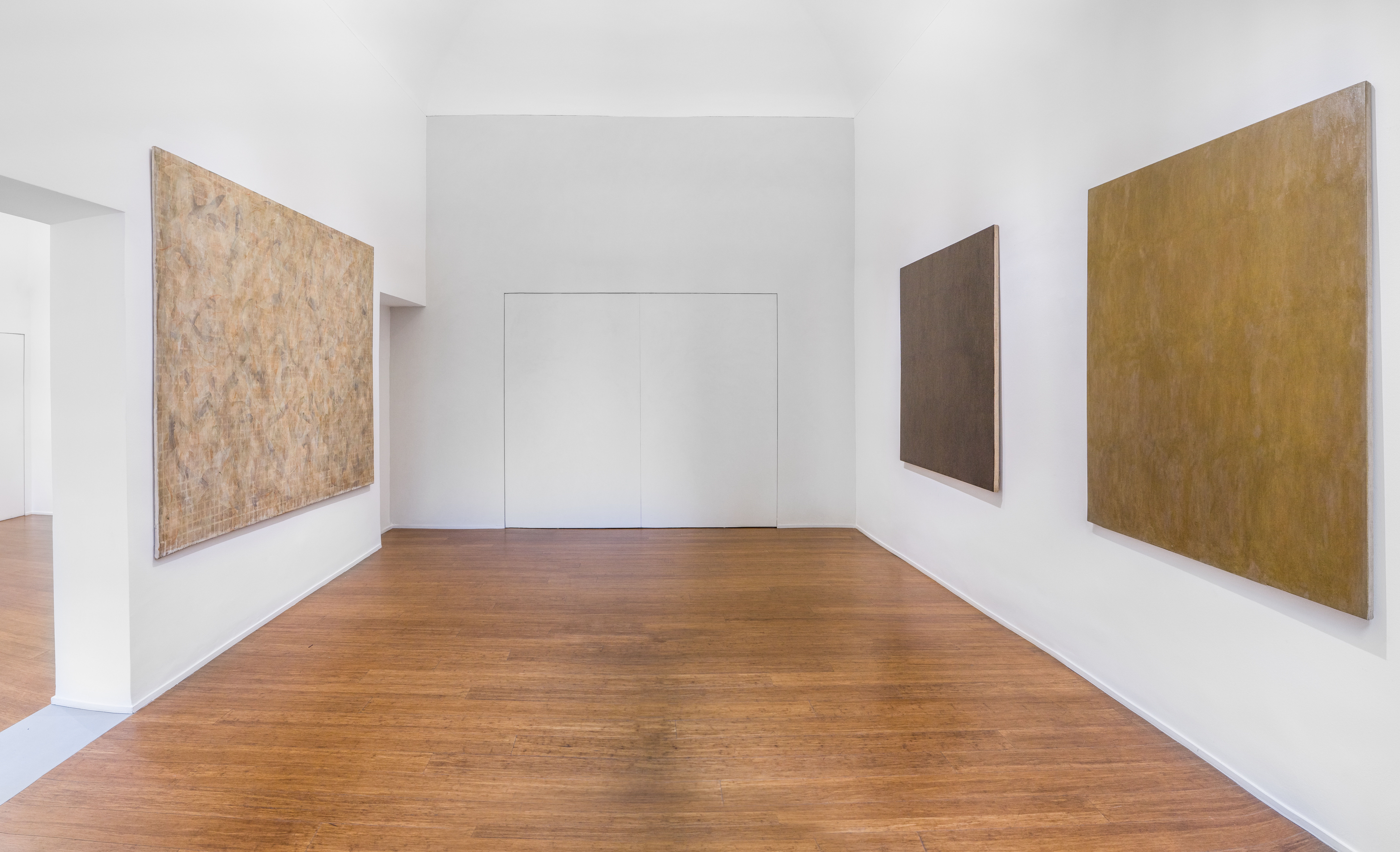 Le griglie di Griffa sono pura latitanza visuale, una soluzione tangenzialmente analitica che Rajlich porta all’apice della definizione con le sue strutture reticolari “elastiche”, in grado tra gli anni 70/80 di allargarsi/stringersi con una duttilità notevole. E in quei decenni l’artista di Praga è stato in grado d’istituire una sorta di fenomenologia più che della pittura analitica in senso stretto della “meta-analiticità”, producendo opere in cui i suoi adorati reticoli rassomigliano pesantemente a pagine quadrettate, e dove gli sono bastate tre pennellate di acrilico in ogni quadretto per costituire un movimento di smaterializzazione strutturale complessivo degno di un ricercatore di cinetico-programmatico. Se a distanza l’Untitled del 1980 pare in costante dissolvimento è tutto merito di una radicalizzazione sempre più rigorosa raggiunta dal gesto pittorico in quegli anni, ma anche delle sperimentazioni indomite di un artista che non ha avuto il timore di osare, fino a far collassare quella stessa idea di rigore, aprendosi la strada verso nuove percezioni formali. Che non ce ne voglia Griffa, ma Rajlich alza la complessità di questo gioco a tre, dimostrando come il corredo genetico di un analitico possa mutare in modo totalmente inatteso, comprendendo anche i cromosomi orientali di un maestro Gutai nello spennellare l’acrilico con un senso programmatico, in una macchinazione di gesto spinta che pare nata da una costola del movimento giapponese. È un gioco di piani ritmici che a vederlo e rivederlo non passa mai di moda, come la natura infusa nelle grandi tele Untitled 64 e 65 di Zeniuk che gli fanno da contraltare, due monocromi dello stesso decennio impostati sui toni terrosi. Più che proporsi sfrontatamente fanno quasi capolino, spazio dopo spazio, in una collocazione assolutamente ottimale per dar sfogo alla loro fattura analitica “ansiogena”, addizionata da un che di misteriosamente empatico-espressivo nell’offrire variazioni tonali rese lucido-opache dall’utilizzo della cera mista all’olio. In riga con i fondamenti certi nel far capire che la pittura analitica è pittura e nulla più, oggettivazione di uno spazio che non deve fuoriuscire dalla propria bi-dimensione. Escludere dall’azione compositiva i bordi esterni della tela non è perciò un vezzo, ma un obbligo più che formale.