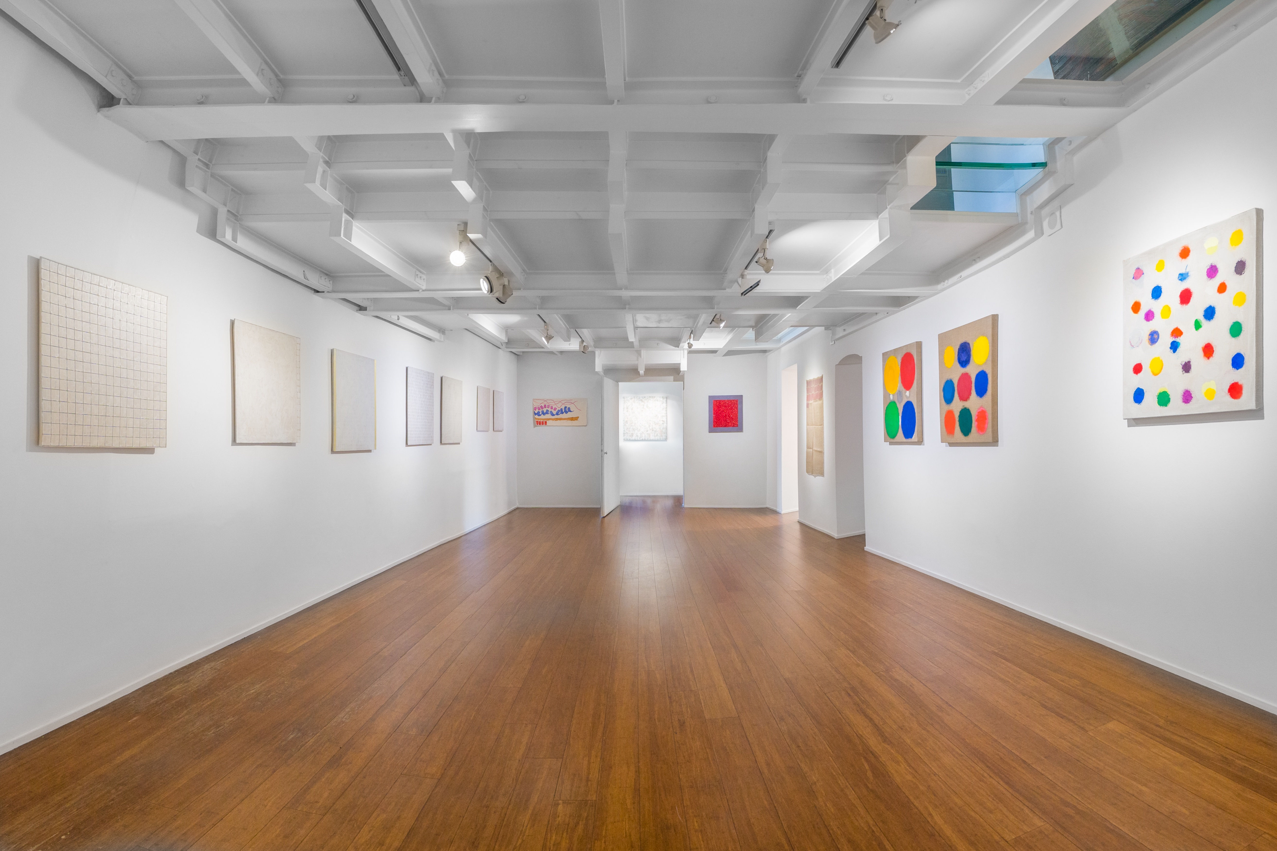 Le uniche due tele d’epoca presenti bastano a costruire attorno a Zeniuk un caso. L’anima dell’artista tedesco non è cambiata, ma la pelle si, e in maniera pesante dagli anni Duemila, da quando propone l’analiticità molto più naif dei suoi “pallettoni”. Dei cerchi che, come i reticoli di Rajlich, tendono ad allargarsi o stringersi a seconda delle esigenze. Il pois è sempre di tendenza, colorato ancor di più; non sconfessa la ricerca spasmodica di un ritmo base e confessa l’azione-flusso di Zeniuk, la sua totale assenza di un pre-ordine, evidente nelle cancellature che l’artista talvolta mette in atto senza troppi problemi, magari spostando una palletta rossa “cascata” un po’ più a destra, nella sua collocazione compositivamente più consona. Il nuovo millennio ha dotato Zeniuk di un’interfaccia user-friendly, rispetto al passato l’ha reso maggiormente vicino agli utenti con l’amabilità delle sue composizioni colorate, che per sintesi strutturale regalano alla pittura analitica una valenza concettuale inaspettatamente impastata al folclore di un rito noto a gran parte della popolazione mondiale. Perché nelle grandi dimensioni Zeniuk lavora un po’ come quando si fa l’albero di natale, e di converso chi compone il suo alberello a dicembre – che già compie una radicalizzazione simbolica non da poco – si avvicina senza saperlo all’impostazione analitico-contemporanea di Zeniuk: entrambi sconfessano una progettualità stringente a favore di un’azione rimodulabile in corso d’opera, mettendo, togliendo e spostando elementi fino ad ottenere una forma compositiva che nel suo complesso non sia solo armonica, ma personalmente assoluta. La libertà “vigilata” insita nelle recenti tele di Zeniuk è il prodotto di una visione analitico-radicale molto partecipativa, molto contemporanea e senza dubbio molto più diretta a sollazzare i neo-collezionisti. Tanto valida nelle intenzioni quanto funzionale asso nella manica di un presente pittorico che, messo a confronto al passato, altrimenti risulterebbe tendenzialmente in perdita.