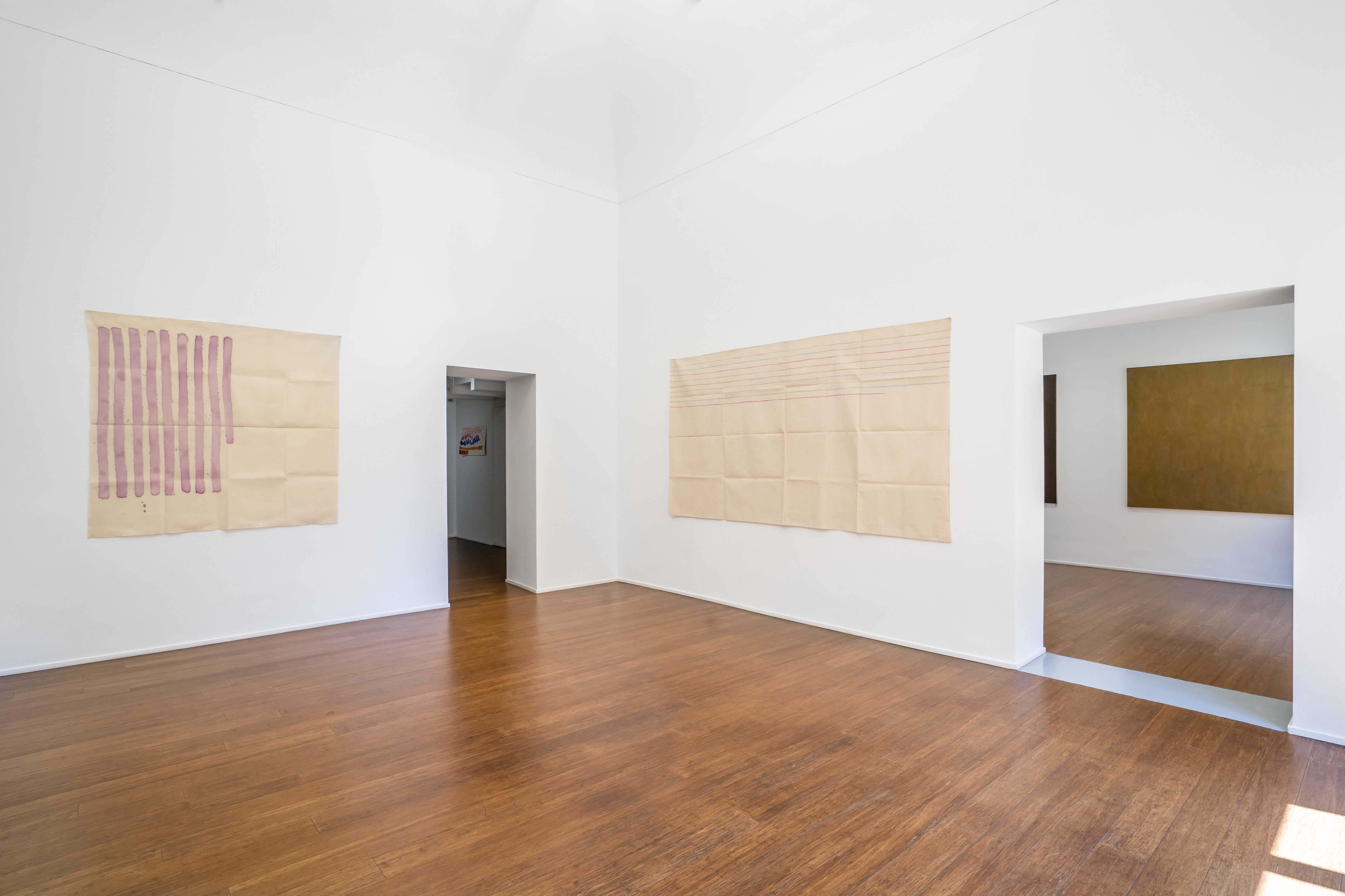 Pezzi scelti opportunamente e display filante nel produrre un confronto dialetticamente vivo per tre artisti in piena evoluzione espressiva. Tre “diversamente giovani” sulla cresta di un’onda che questa mostra cavalca stabilmente, riuscendo non solo a far valere capacità singole e singolari, ma ad ampliare anche il dibattito su un genere pittorico tra i meno definiti (la pittura analitica non essendo un movimento specifico è più assimilabile ad una macro area poli-comprensiva sul piano tecnico). E a furia di allargare alla fine salta fuori l’elemento fondamentale, quello che rende artisti provenienti da differenti fasce d’influenza geo-intellettuale una corazzata unita nell’analiticità delle proprie scelte. Tra loro si aggira un compagno fidato, si chiama “tempo pittorico”, per gli amici ritmo. Attore co-protagonista tra linee, tratteggi e quant’altro generato dalla mano libera di Griffa, azione in cui l’artista include interruzioni arbitrarie come pause, come un silenzio che non nega il suono e lanciato addosso al pubblico alla John Cage. Sulla pervicacia del pacchetto gestuale standard può intervenire poi il processo finale, la piegatura della tela, in una cadenzata sotto-struttura a griglia che incrociando la fondamentale percezione ritmica dell’artista torinese la completa.