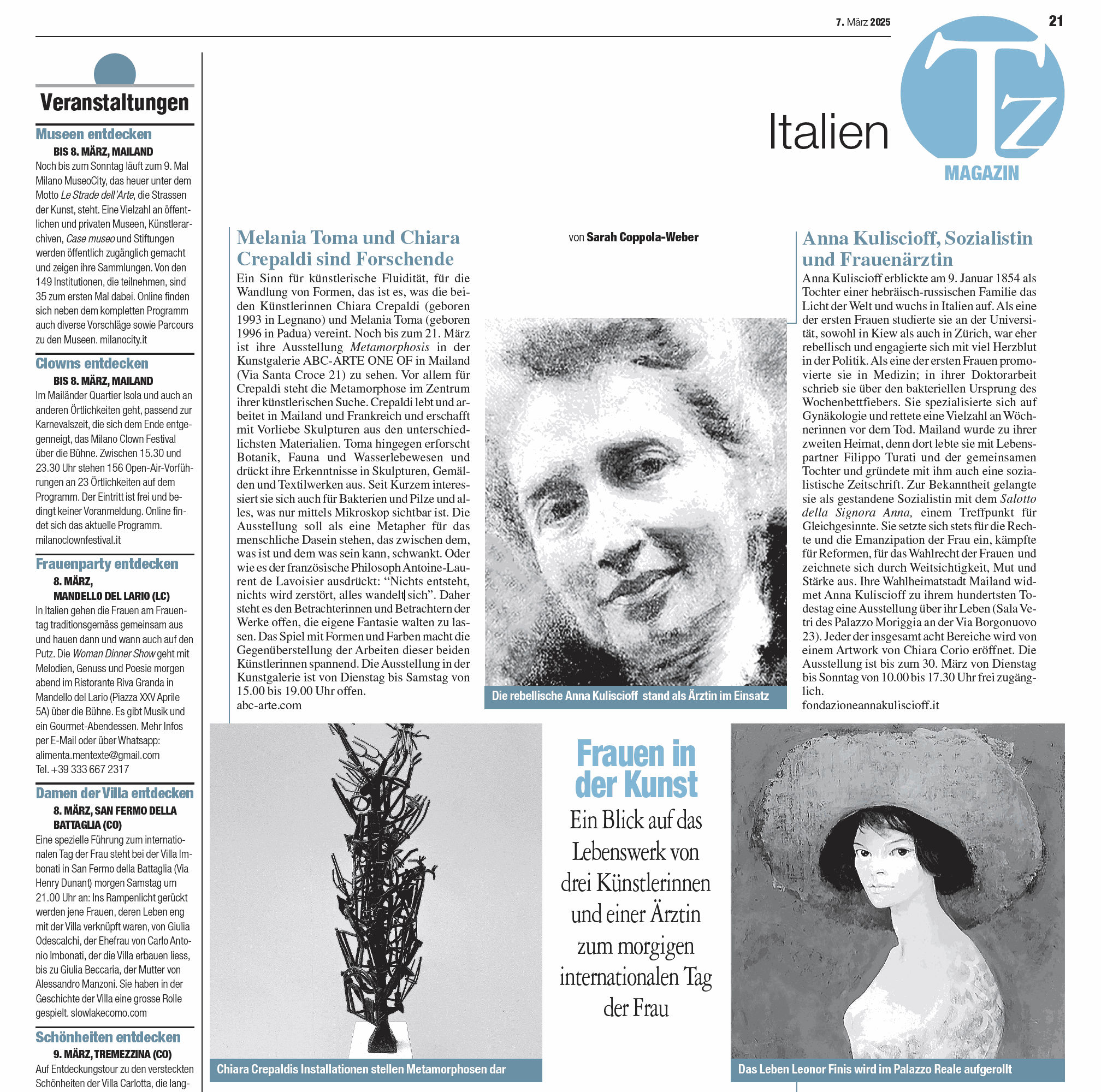 Il senso della fluidità artistica, della trasformazione delle forme, è ciò che accomuna le due artiste Chiara Crepaldi (nata a Legnano nel 1993) e Melania Toma (nata a Padova nel 1996). La loro mostra Metamorphoses è visitabile presso la galleria d'arte ABC-ARTE ONE OF di Milano (Via Santa Croce 21) fino al 21 marzo.