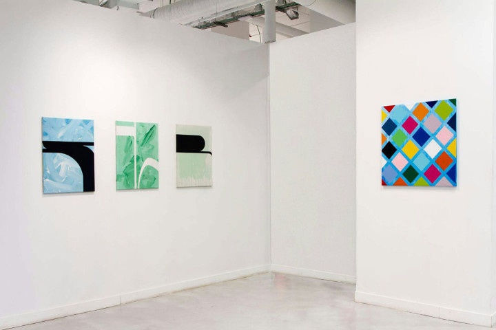 Una linea retta dove la pittura – quella vera, passata a una sublimata astrazione, senza orpelli e senza racconti – è chiara e pura, resa gradevole dalla complessità dei pattern, e dal gioco di colore che Zanet utilizza senza mai troppo rigore. In mostra circa 15 opere legate da un sistema narrativo assolutamente astratto, ma, di opera in opera, diverso: alcuni lavori molto pop con losanghe colorate e sgocciolature, più ornamentali rispetto al rigore della pittura analitica di tele più piccole e rigorose, in relazione con i tessuti e i pattern esposti all’interno dello spazio. Da sempre nel lavoro di Zanet i titoli sono importanti e rappresentativi:L’infallibilità dell’erroreCadereMinimal experimentsUn’inutile trasparenza o La malleabilità del tempo … tutti messaggi poco rassicuranti e ancora in progress, alla ricerca di equilibrio e sicurezza. Quell’equilibrio e sicurezza a cui Giulio Zanet sta arrivando, attraverso questo corpo di lavoro riconoscibile degli ultimi 2 anni di percorso, dopo la narrazione delle storie grottesche e surreali dei primi lavori, figurativi e fatti di immagini bloccate nel tempo. Tinture e forme che rimangono in testa, speriamo anche nel tempo.